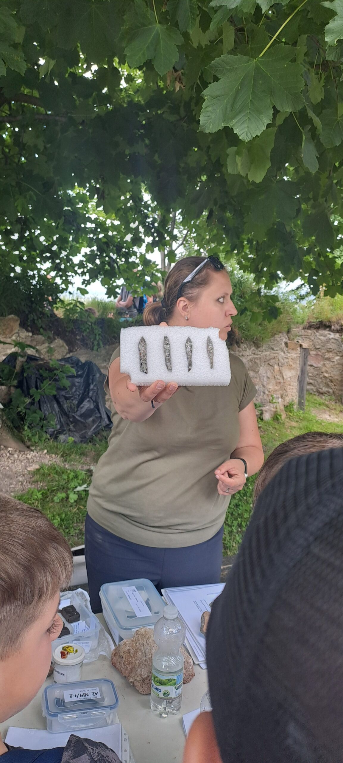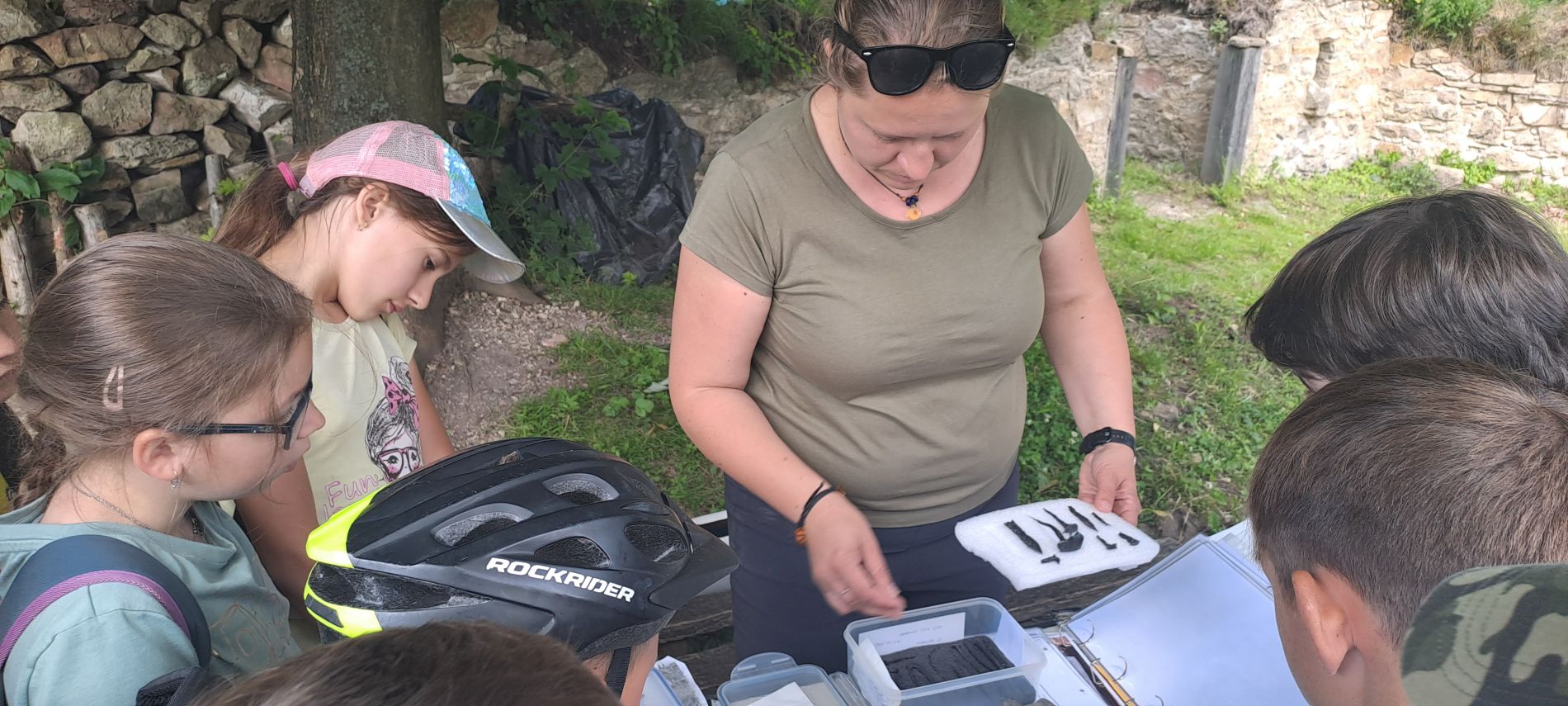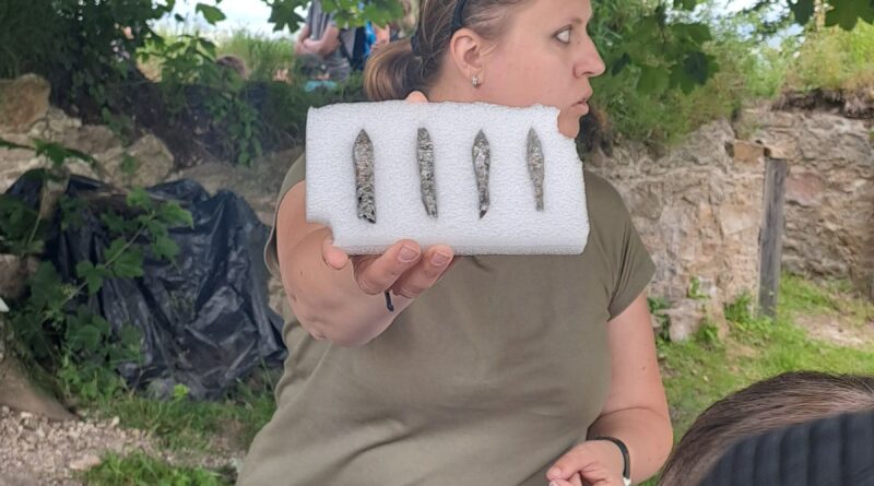 Odlévali jsme repliku pečeti, která se našla na hradu při archeologických výzkumech (nejvzácnější objev). Dále jsme si mohli prohlédnout hroty šípů, zámek, podkovu s hřebíčkem, osahali jsme si kachlík z kamen a potěžkali kousek dělové koule.