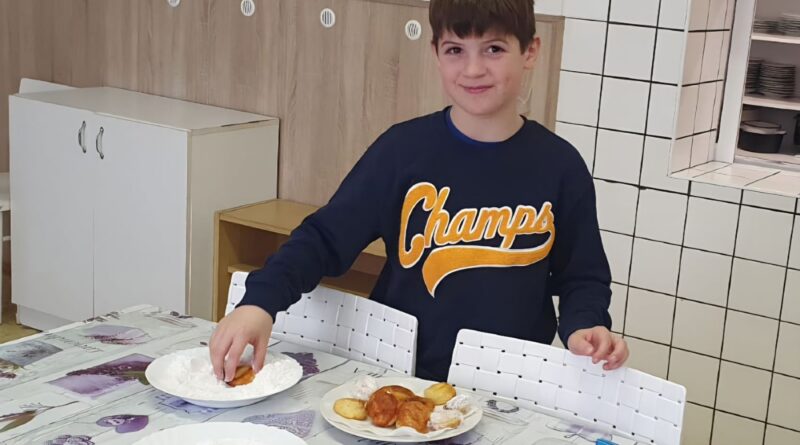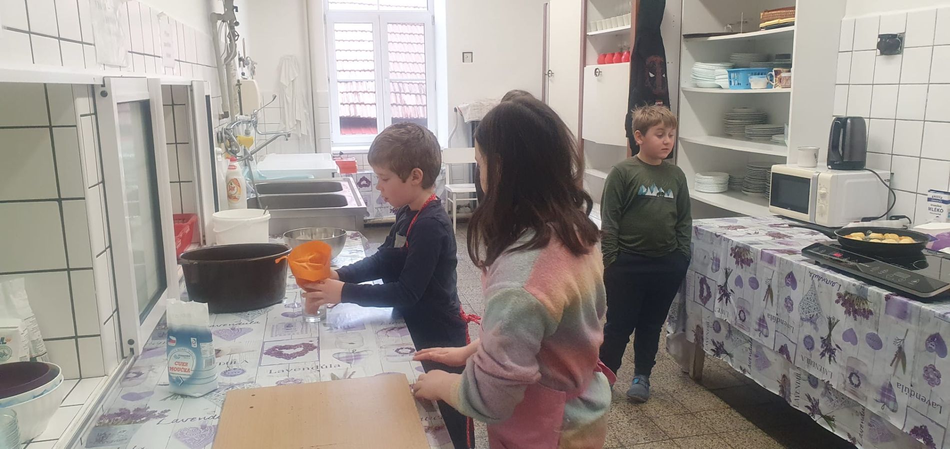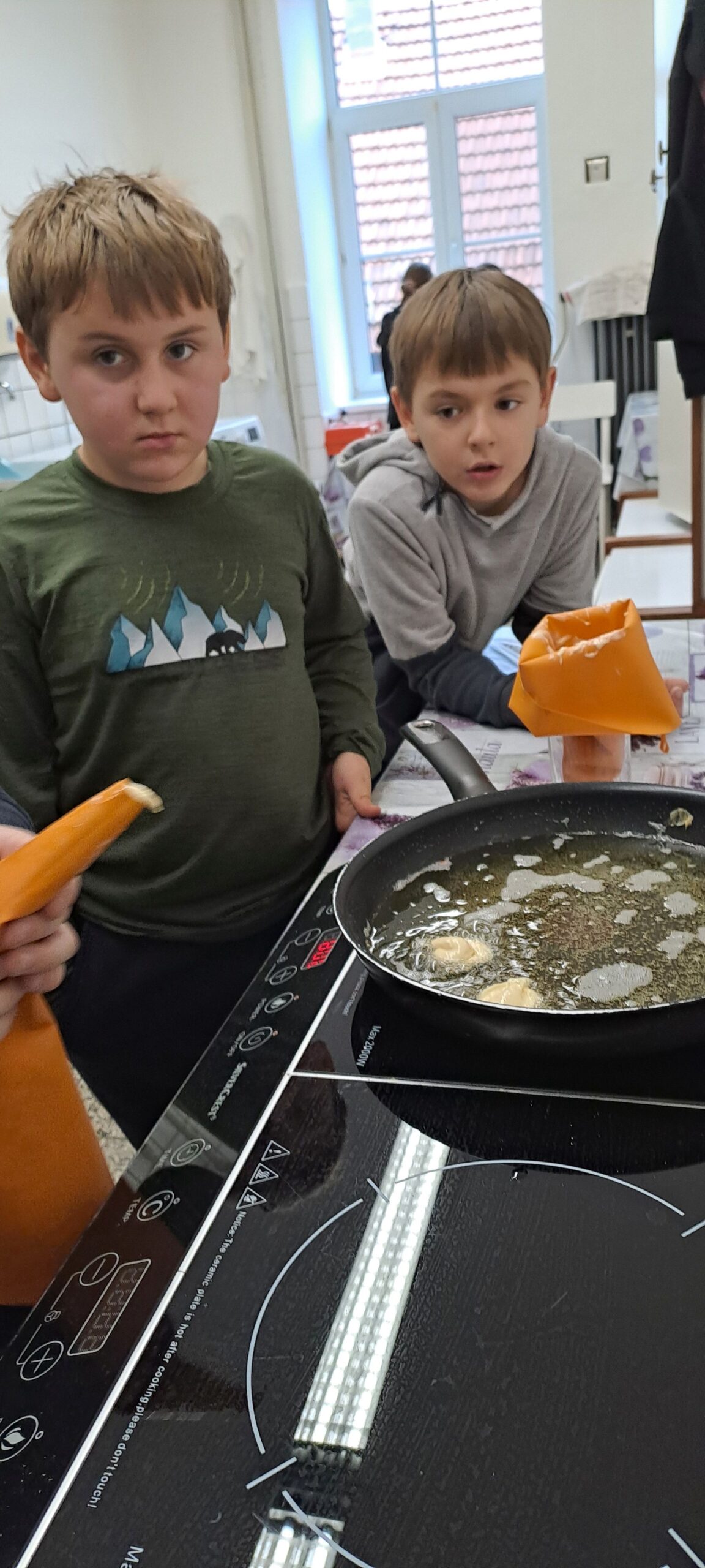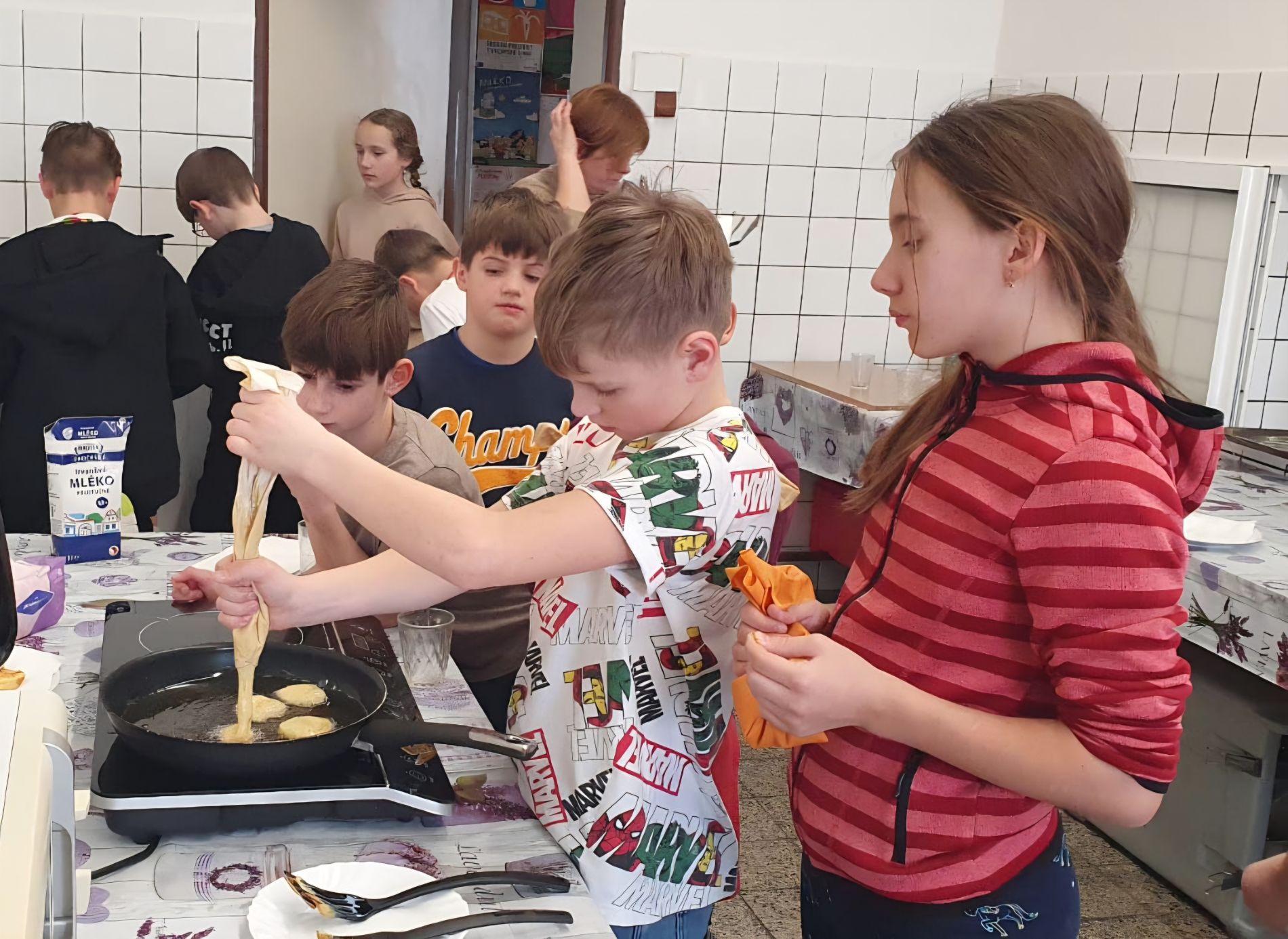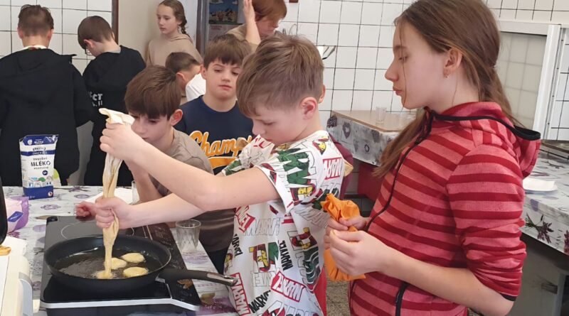 Masopust si připomínáme nejen tradičním smažením koblížků. Letos jsme se rozdělili do dvou skupin. Nejdříve své kuchařské dovednosti trénovali žáci 1., 2. a 3. ročníku. Pracovali ve dvojicích – starší a mladší, aby ti zkušenější spolužáci provázeli ty mladší. O skupinkách rozhodl los. Dvojičky si četly recept, vážily mouku a množství tvarohu. Společně pak jednotlivé suroviny smíchaly do hladkého těsta a smažily. Na všechny činnosti (zvlášť na smažení) dohlíželi paní učitelky Renata Pospíšilová, Barbora Hrušková, paní asistentka Jana Štůralová a pan asistent Daniel Cindler. Žáci 4. a 5. ročníku pracovali samostatně. Jsou větší a mají více zkušeností. Podle receptu si zkušení kuchtíci připravili těsto a pak opatrně smažili. Usmažené bochánky obalovali ve směsi moučkového a vanilkového cukru. Malí kuchaři si poradili se všemi nástrahami při vaření, ale nejtěžší úkol na ně teprve čekal – úklid. Naštěstí jsme měli úžasné pomocníky – paní Bobkovou, která pomohla s hromadami nádobí, paní asistentka Štůralová kontrolovala utřené stoly a židle. Pan asistent Cindler fotil nezapomenutelné momenty našeho kuchařského snažení.