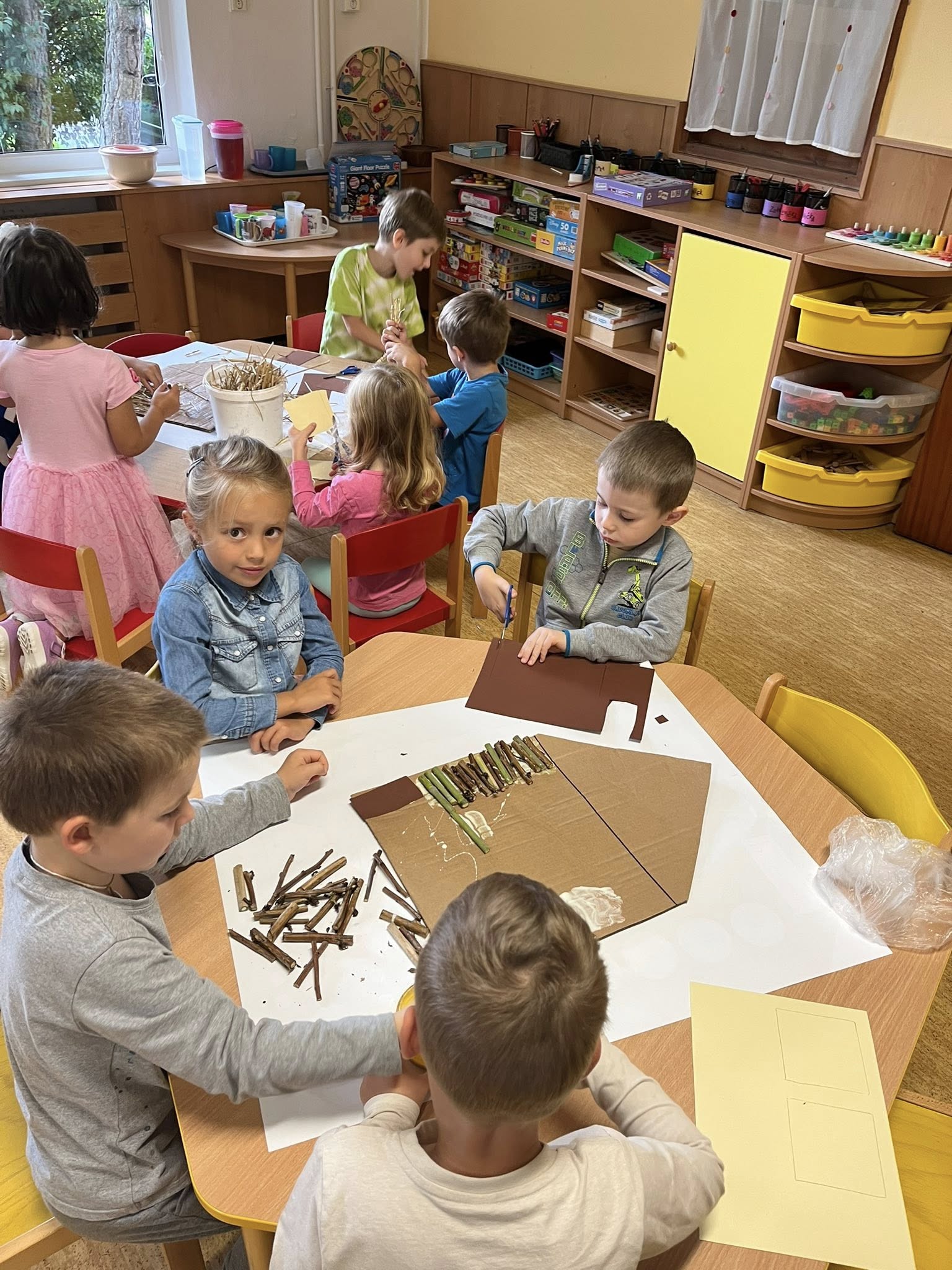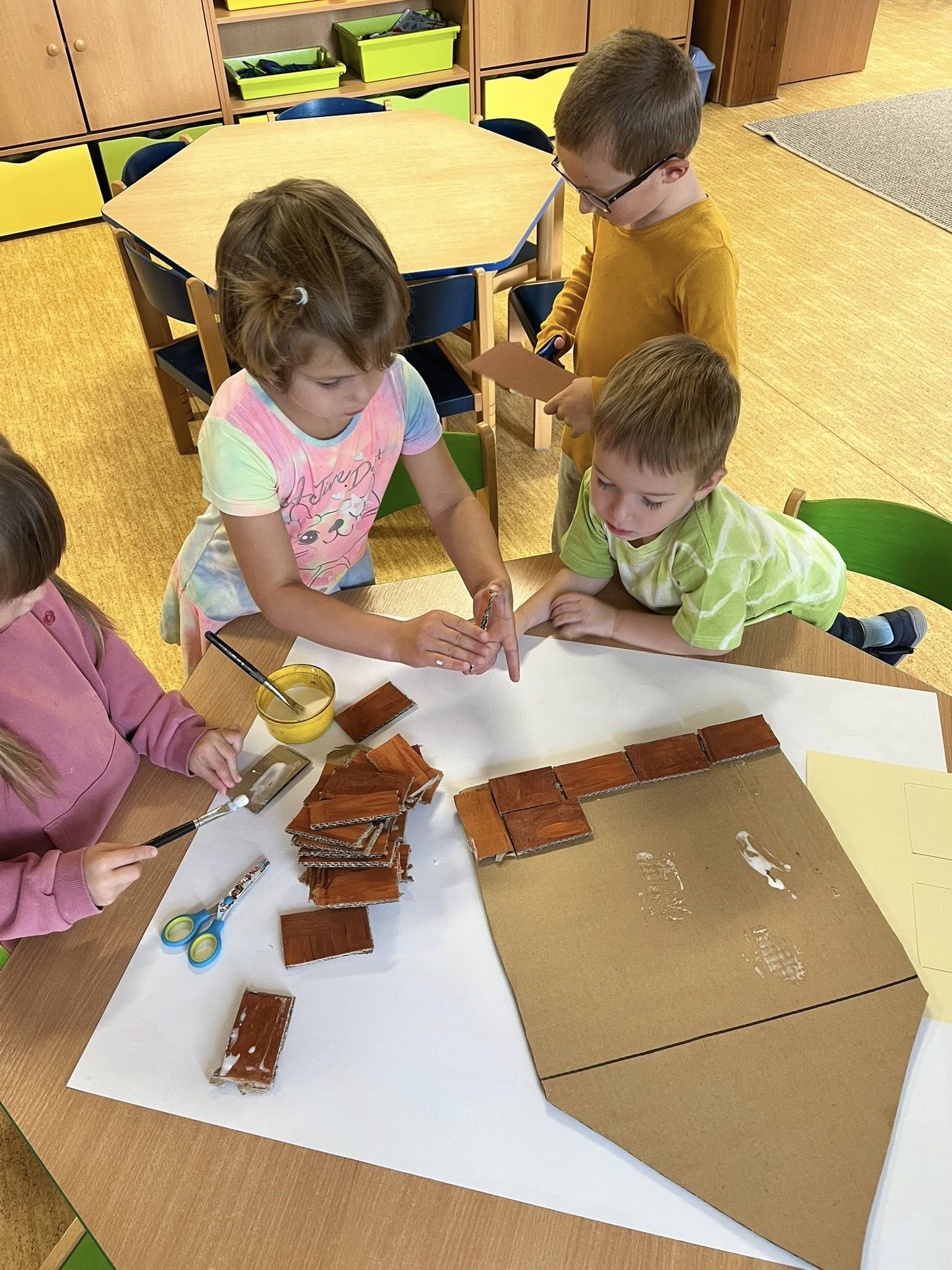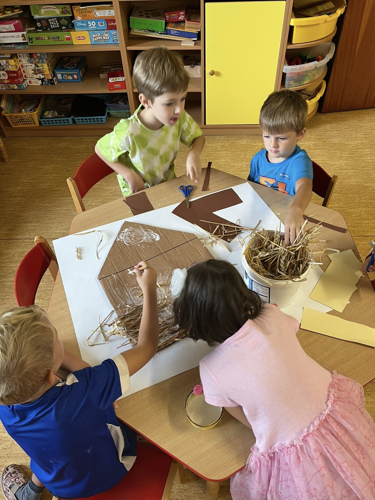 Po přečtení známé pohádky jsme se společně vrhli na výrobu domečků ze slámy, dřeva a cihel. Šlo nám to moc pěkně.