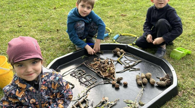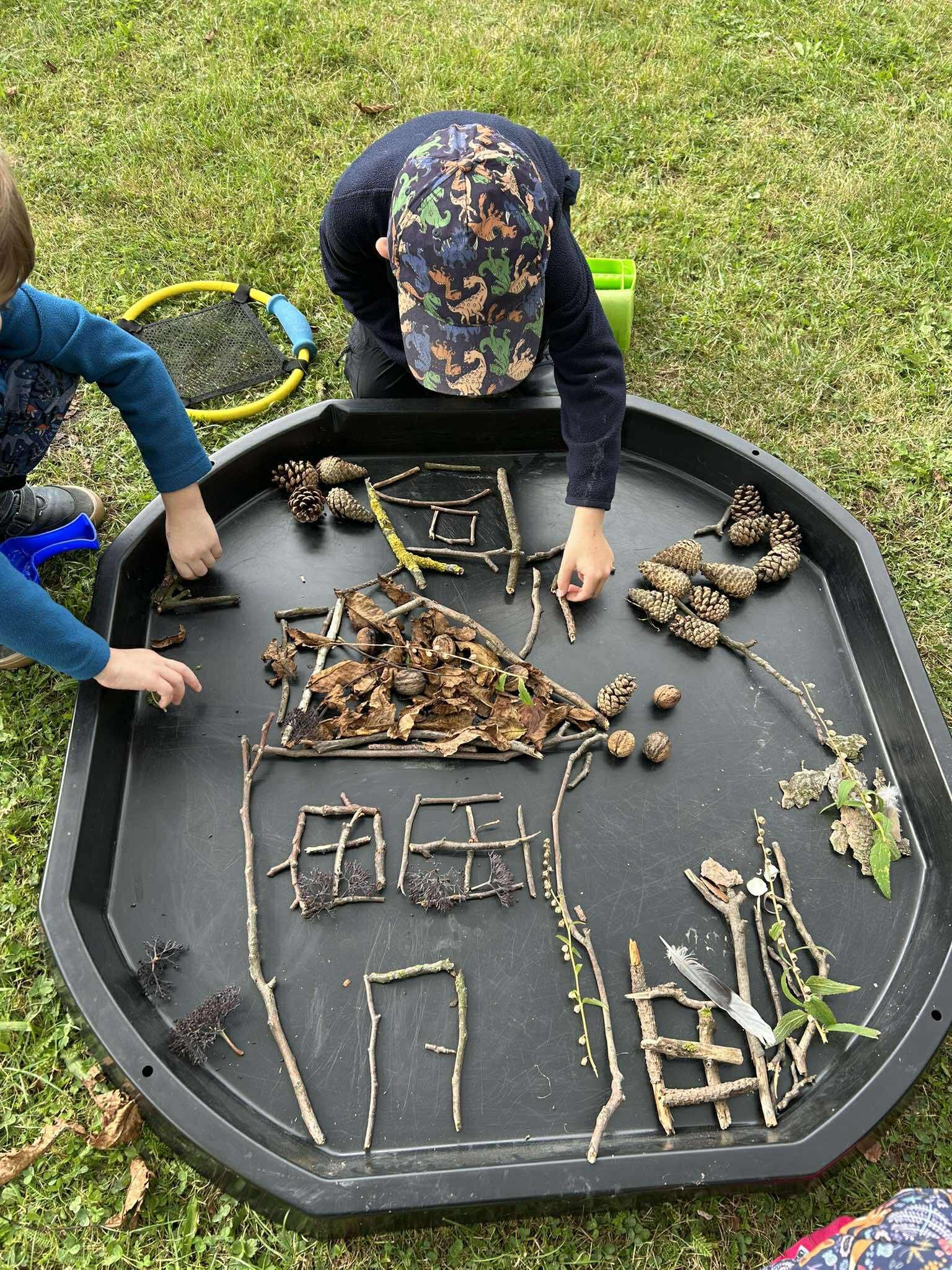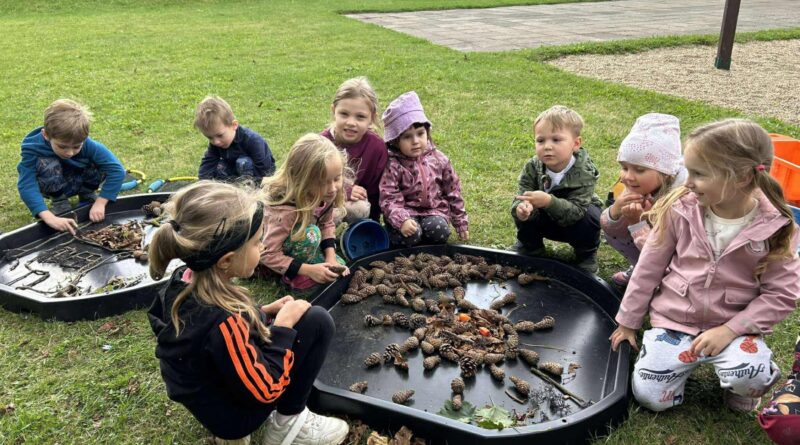 Zvídavé hlavičky přišly na to, že i z tohoto materiálu lze vytvořit krásné obrázky. Oprášili jsme tedy naše smyslové boxy, které celé léto odpočívaly a tvoření mohlo začít.