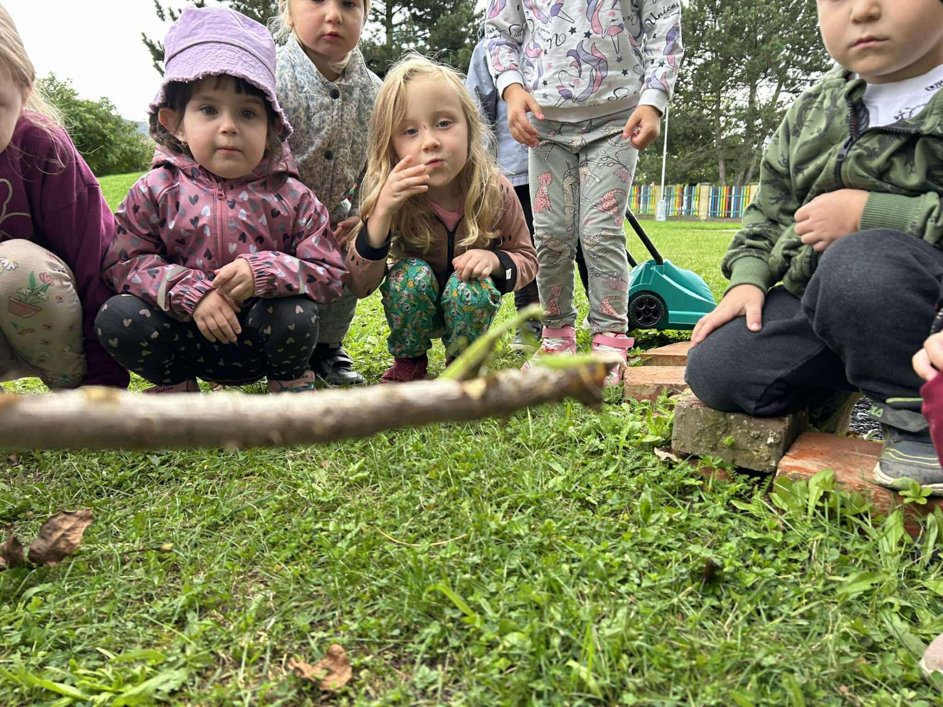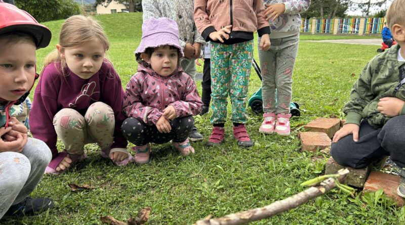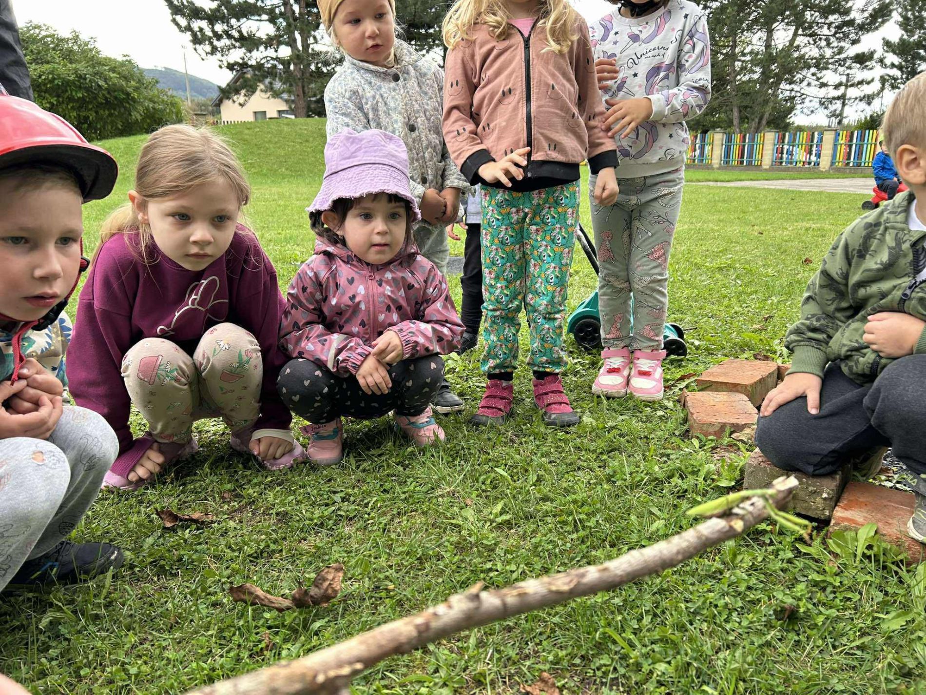 Dílka byla natolik zdařilá, že přilákala i jednu noblesní dámu z říše hmyzu. My jsme tak měli úžasnou možnost prohlédnout si tento krásný exemplář, který se nevidí každý den, velmi zblízka. Po chvíli zkoumání a pozorování jsme raději kudlanku přemístili za plot, aby náhodou nepřišla pod něčí nožkou k úhoně.